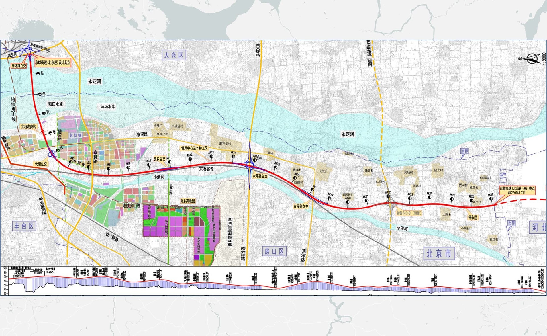 工程北起西五环路,南至京冀市界,道路全长约 27 公里,全线按照高速公路标准设计,设计车速为100-120公里/小时,路基全宽42米,设置互通式立交6座,管理中心1处,主线收费站1处, 匝道收费站3处,停车区2处,智慧交通管理区1处。京雄高速公路(北京段)工程是雄安新区与北京中心城区快速联 系的重要通道,是落实北京市新总规、新一轮城南行动的重要工程,项目建成将缓解北京西南通道交通压力,也将促进京津冀协 同发展,项目桥梁工程占比大,跨永定河特大桥方案技术复杂, 沿线互通立交设置控制因素多。按照国家有关规定及政策,评审过程中对关键技术方案、用地规模进行重点审查,提出优化意见,减少项目占地,保证初步设计技术方案满足适用、安全、经济、合理等要求。