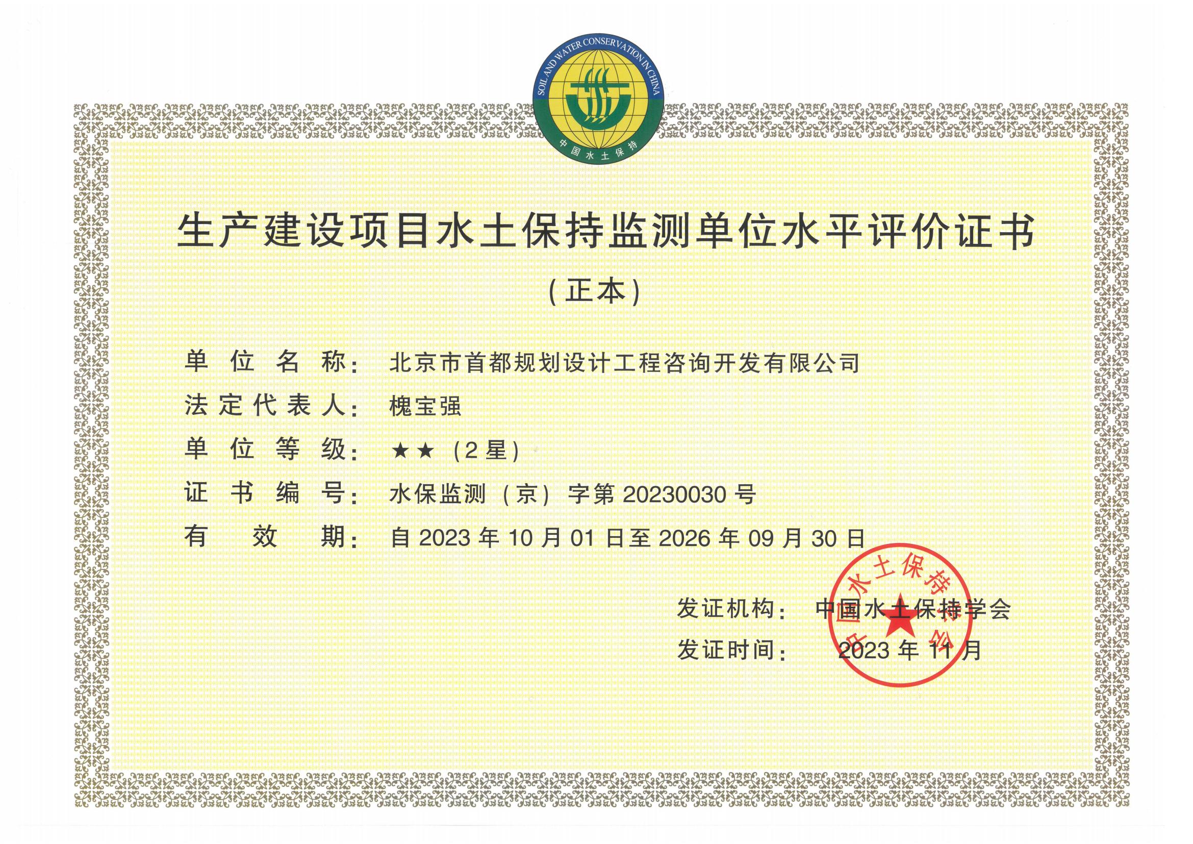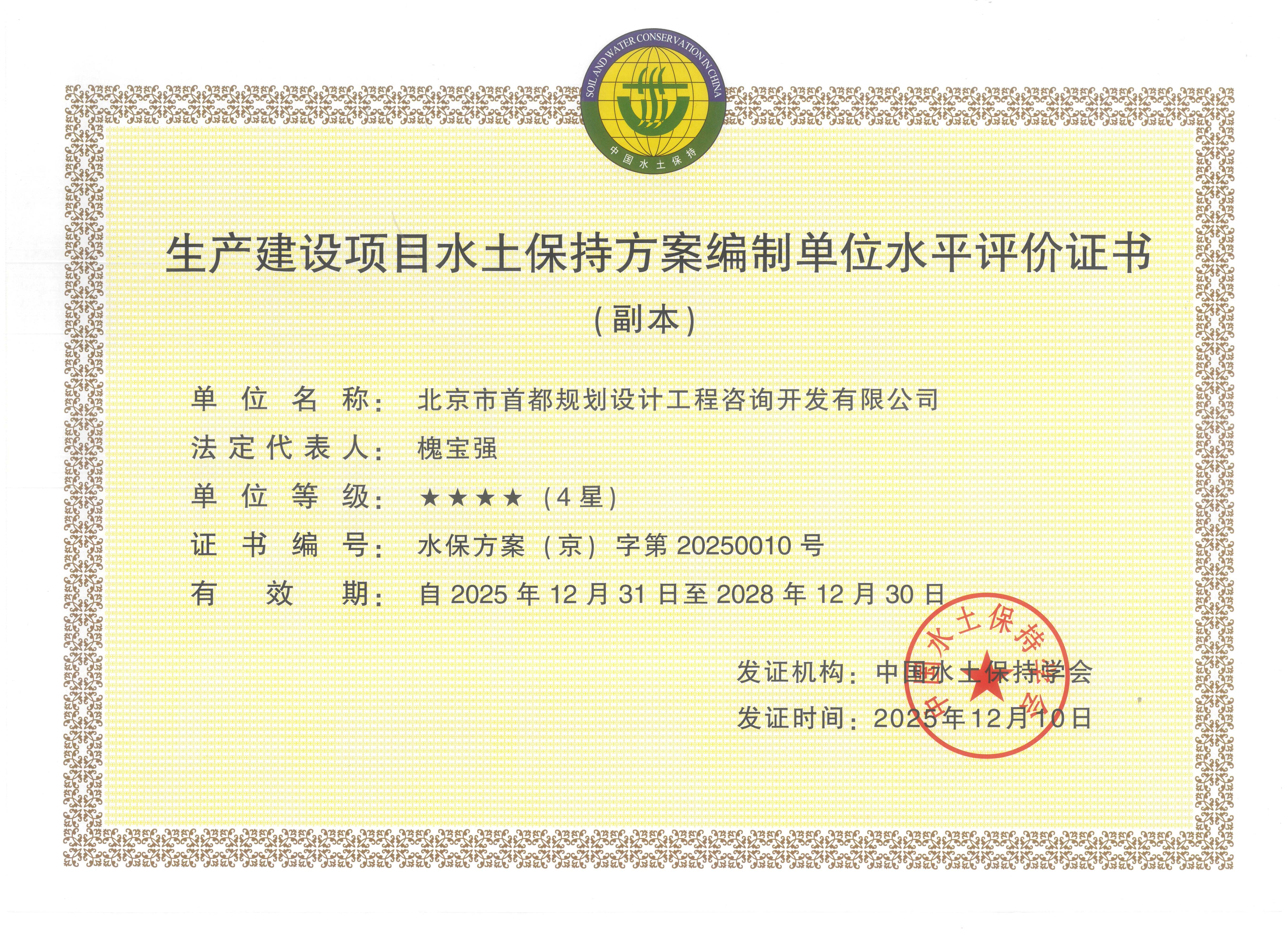 首都规划咨询水文、水资源调查评价单位水平评价证书